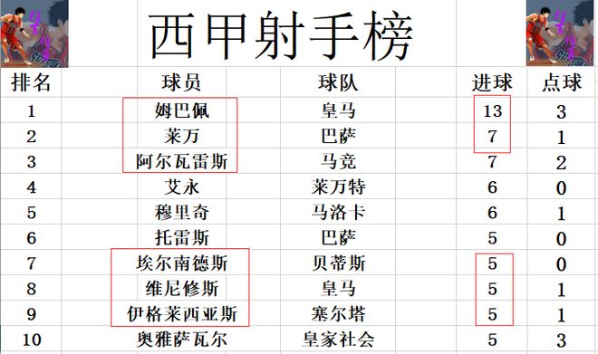 射手榜方面,姆巴佩13球依然是高居榜首,莱万今天上演帽子戏法后追了上来,追平阿尔瓦雷斯,两人7球并列第2,都是少姆巴佩6球。艾永,穆里奇6球并列第4,埃尔南德斯和伊格莱西亚斯今天都打入一球,追上托雷斯,维尼修斯,将前十门槛提高到5球。
